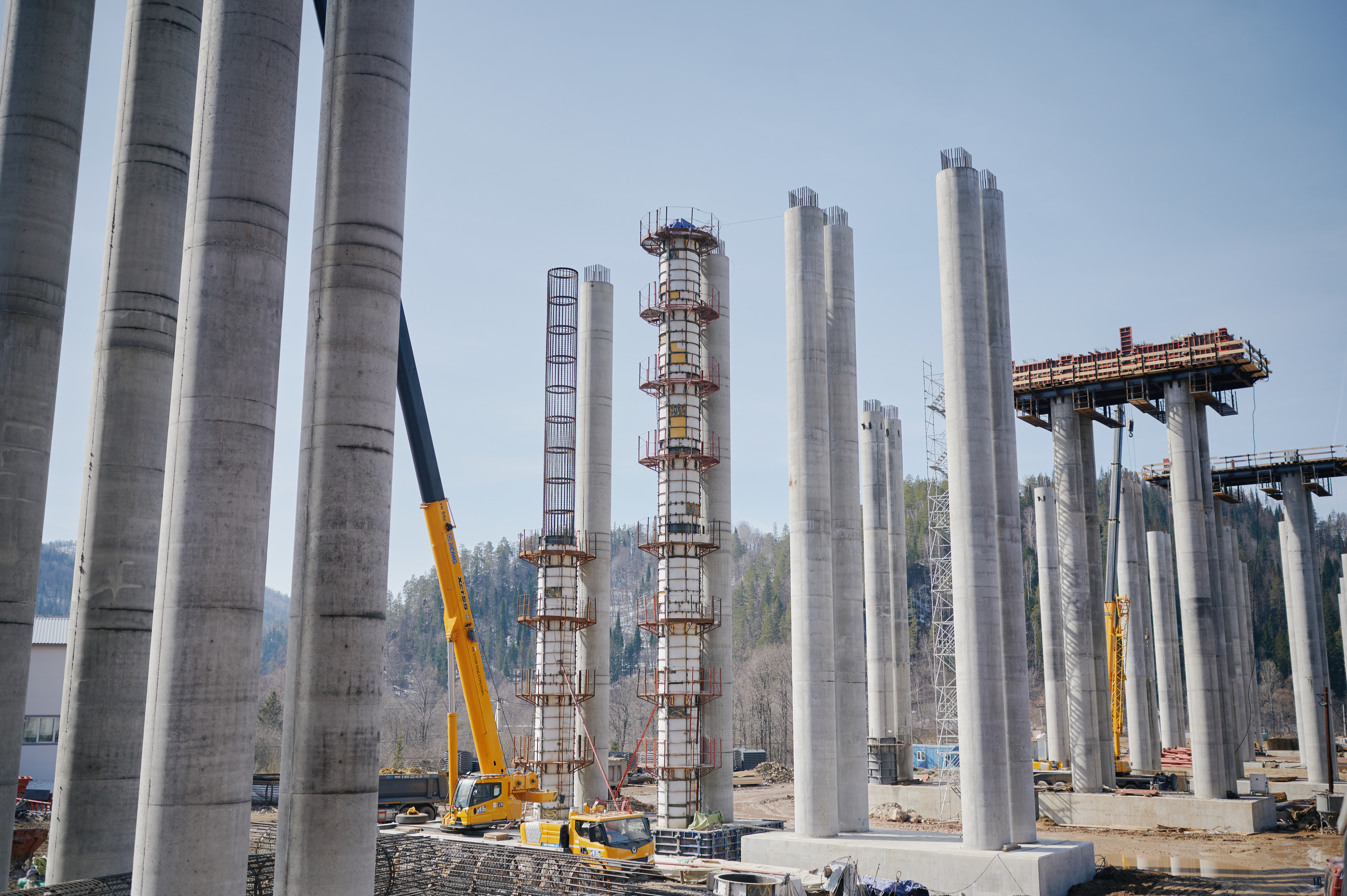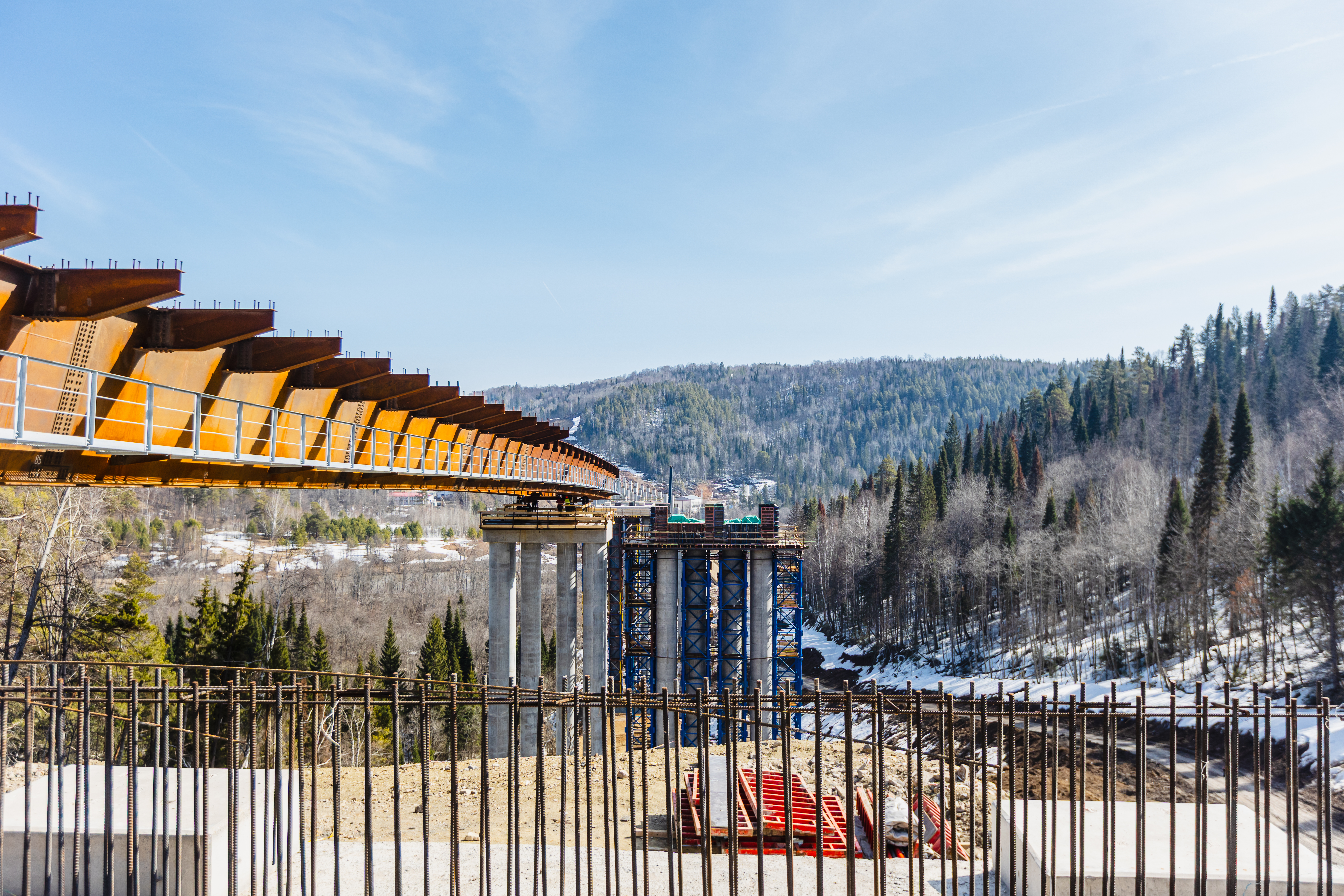 Здесь дорожники продолжают строительство 19-километрового обхода города Сим с самой крупной эстакадой в регионе: высота опор искусственного сооружения достигает 46 м, а длина сталежелезобетонной эстакады составляет почти 1,1 тыс. м.