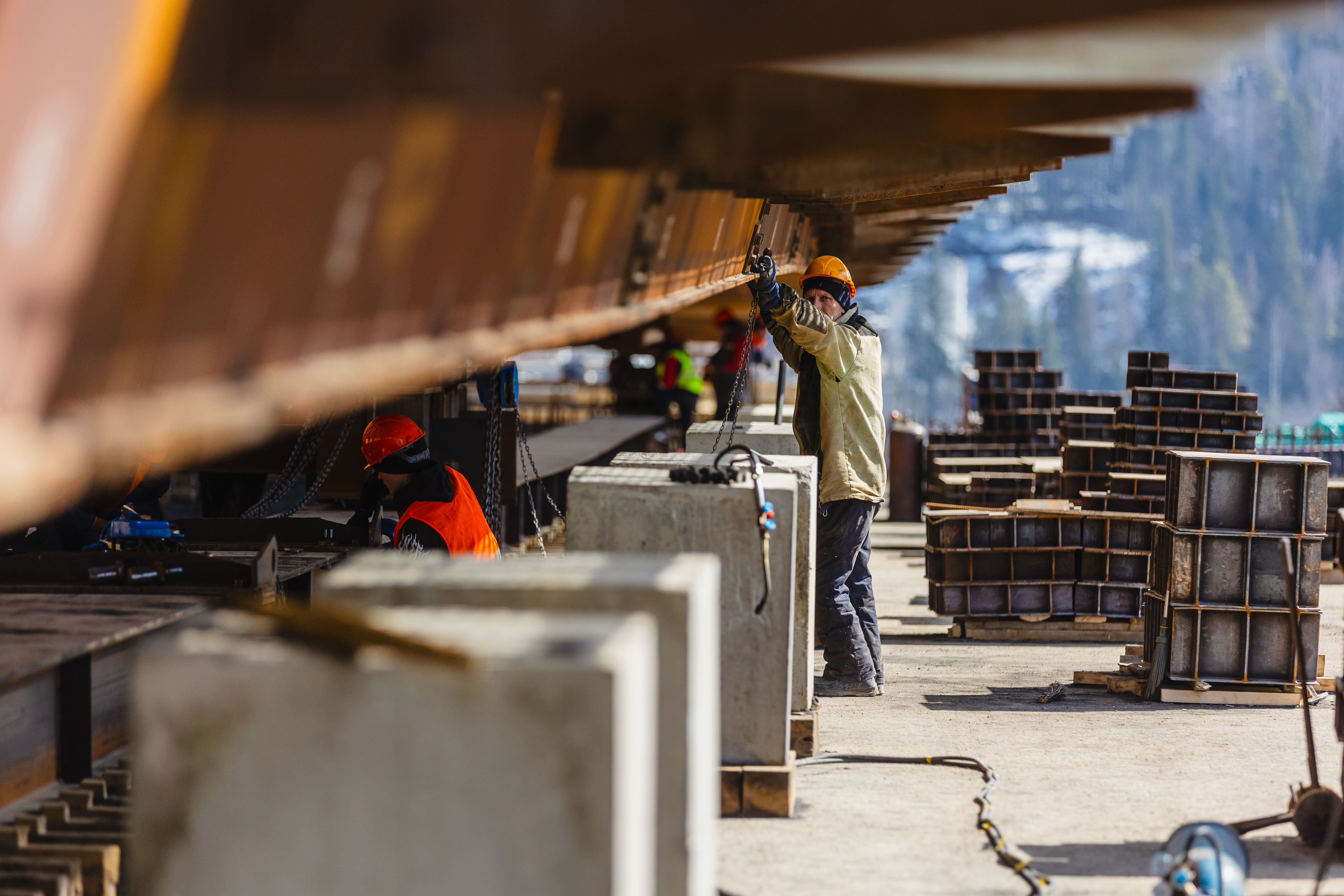 Специалисты завершили первый этап сборки металлоконструкций пролетного строения весом 708 тонн. Также строительные бригады собрали 14 пар балок общей длиной 168 пог. м. В настоящее время уже идет работа по надвижке пролетного строения на вторую опору: металлоконструкцию перемещают примерно на 100 пог. м вдоль оси эстакады.